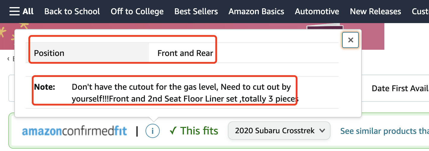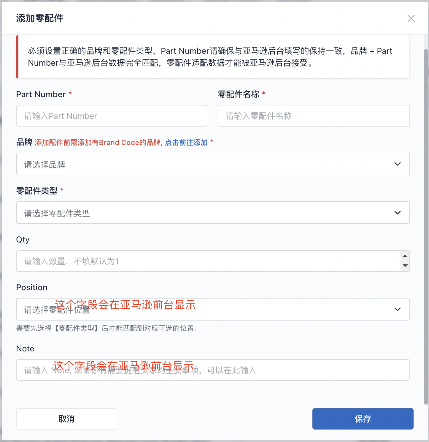 Position: 这个是可选字段,不同的零配件类型可能有不同的Position,意思大概是零配件在车上的安装位置。 如果设置了这个字段,相关的信息可能会在亚马逊前台显示。