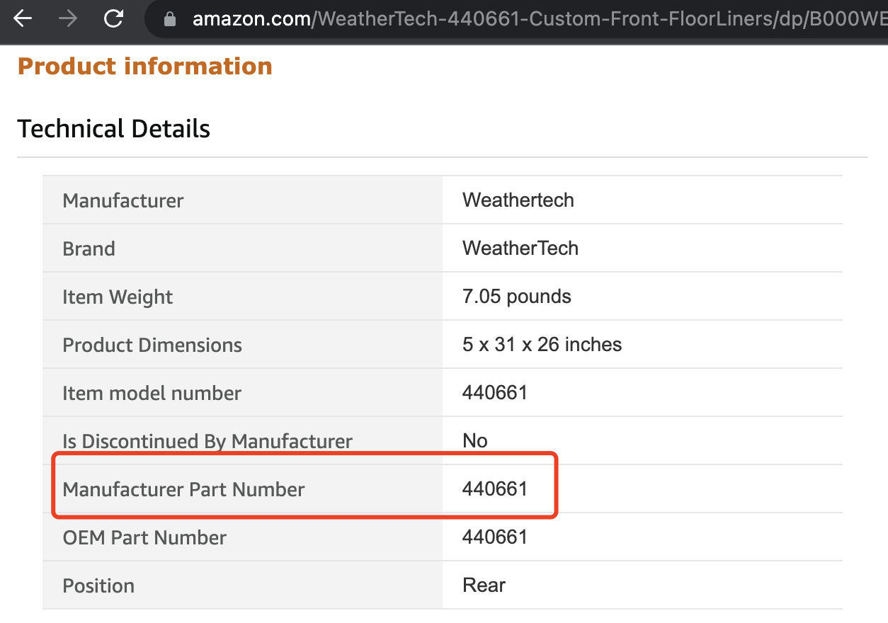 Part Number: 填写亚马逊listing的Manufacturer Part Number,需要在亚马逊后台设置好,这个字段一般在产品链接里能看到