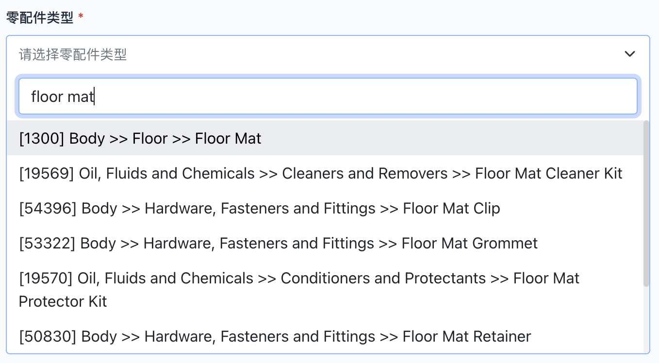 零配件类型: 这个是必填项,根据产品的实际情况,选择合适的类型即可,这个类型跟亚马逊的可以不一样。输入关键词可以搜索合适的另配件类型