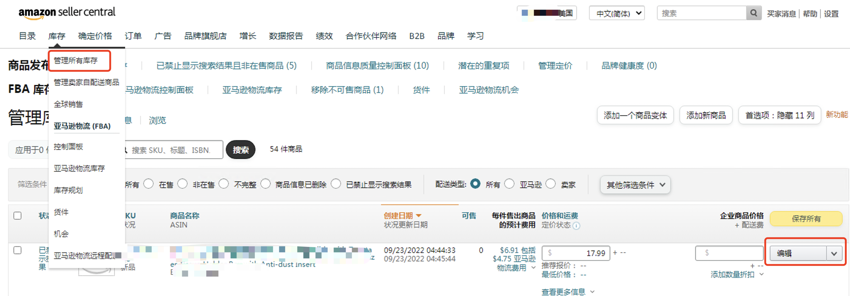 在管理库存界面中,点击编辑listin按钮