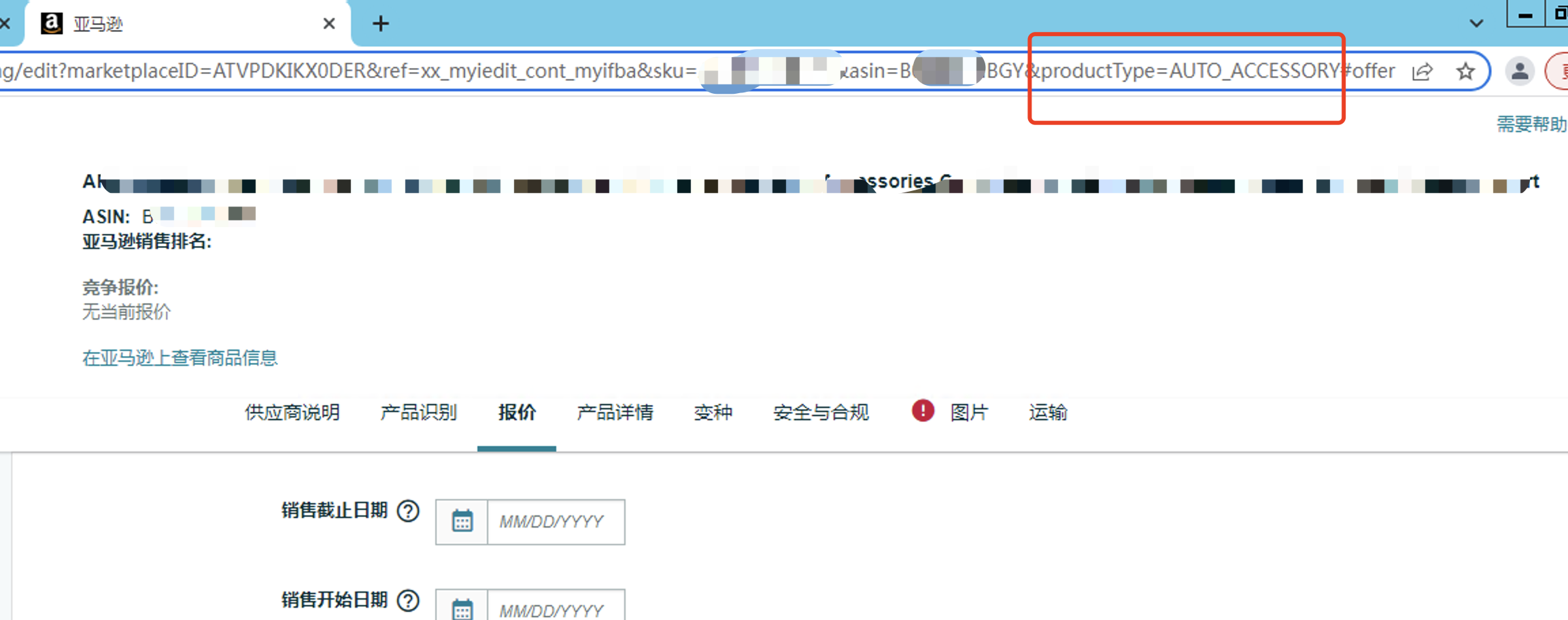 留意浏览器 URL 框里面的链接,链接里面的 productType= 后面的信息才是亚马逊产品的真实分类,如果遇到不是汽配类目的情况,就需要找客服去修改了。