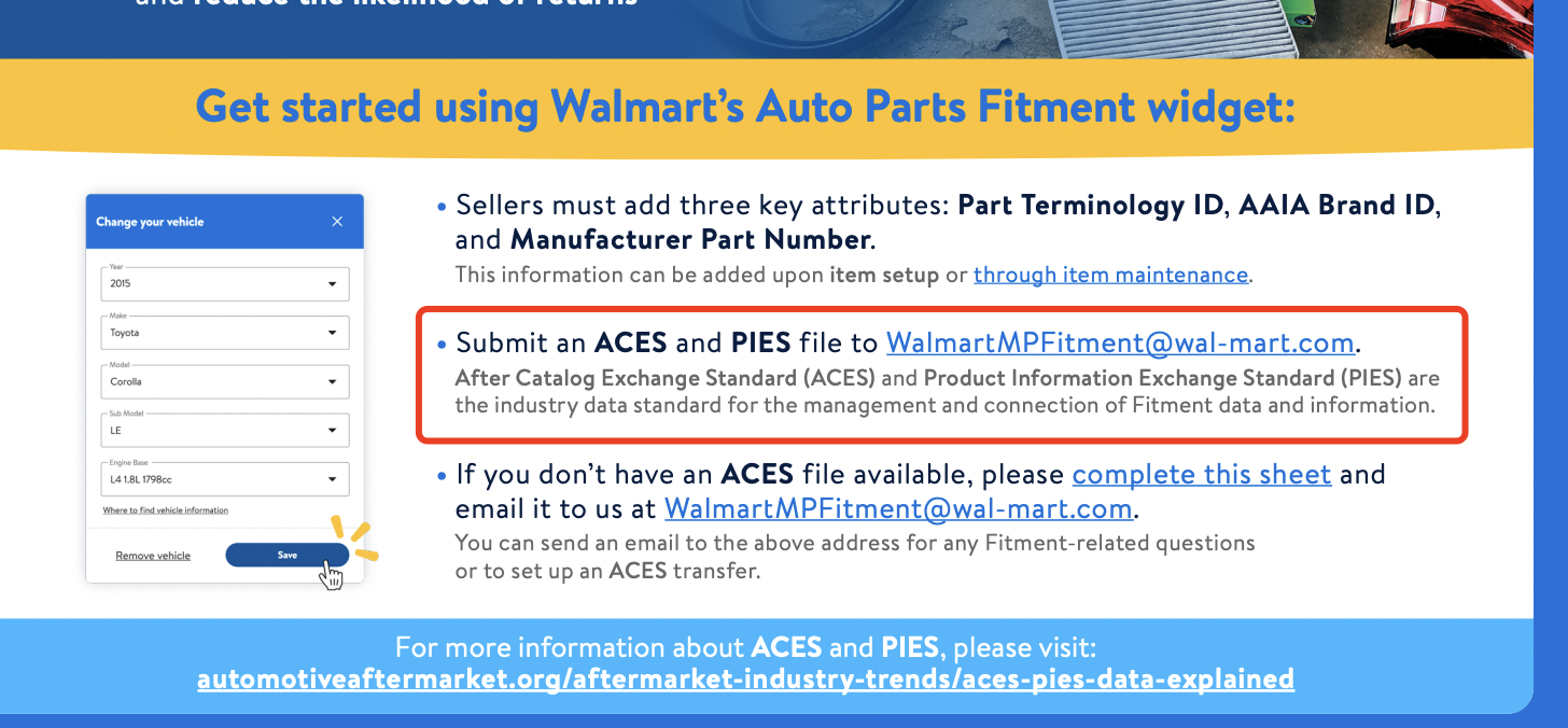 沃尔玛平台汽配设置匹配车型的官方文档: https://marketplace.walmart.com/wp-content/uploads/2022/06/wmp_Fitment-Initiative_one-pager_A.pdf